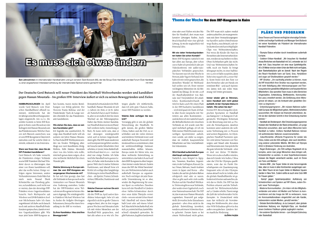 Why did Gerd Butzeck candidate to become IHJF President? What are his goals? Why does he appreciate other candidates? – read the German version of the double page interview of Handballwoche by clicking here. Get the English version by clicking here.